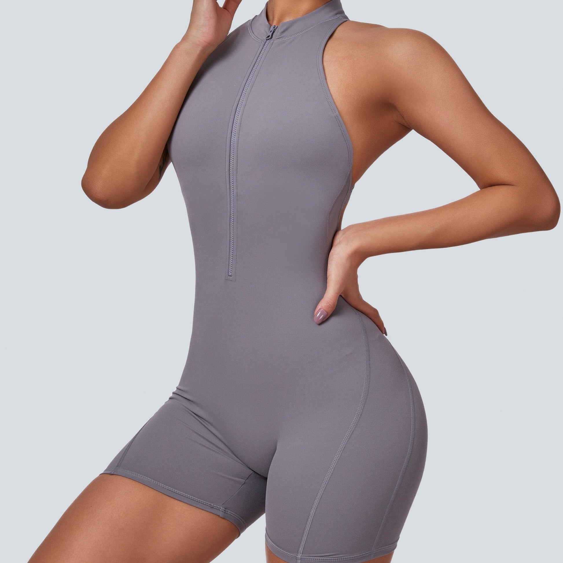 - One-piece romper silhouette for streamlined performance and style
